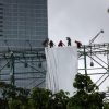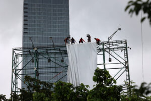 Workers dismantle a tarpaulin billboard along EDSA in San Juan City, Sept. 22, as heavy rains swept across Metro Manila. PHOTO BY MIGUEL DE...