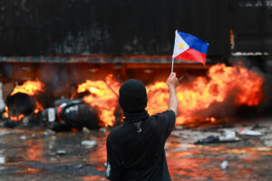 A MAN waves a Philippine flag after young demonstrators staged a violent act along Ayala Bridge near Malacañang compound on Sunday, Sept. 21, 2025....