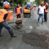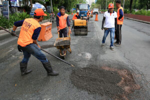 Workers of the Department of Public Works and Highways put temporary asphalt on the potholes along Roxas Blvd. in Manila. — PHILIPPINE STAR/EDD GUMBAN...