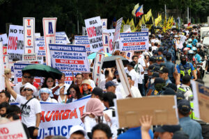 Thousands of participants walk along the northbound lane of EDSA towards the People Power Monument in Quezon City while shouting and holding various placards...