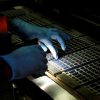 A technician checks the machine with a flashlight at a solar panel manufacturing hub in Greater Noida, on the outskirts of New Delhi India,...